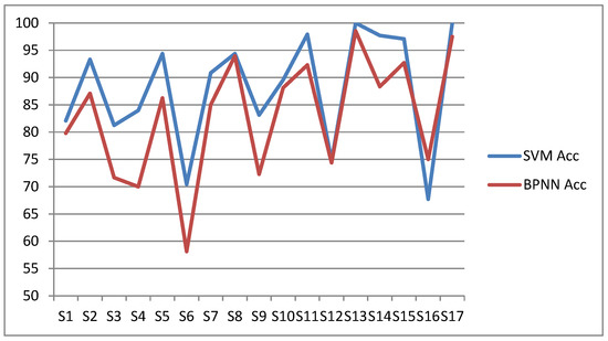 Highest accuracy for each subject with SVM or BPNN classifier. The horizontal axis is the subject index and the vertical axis is accuracy.