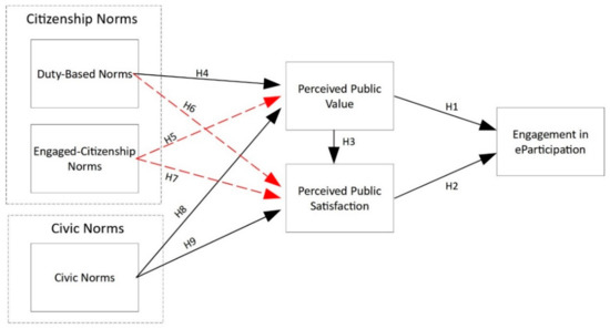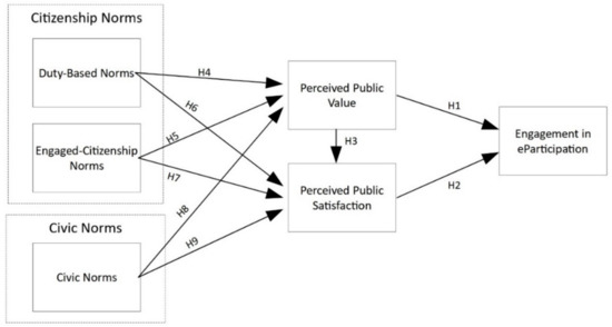 Hence, this research argues that both engaged-citizenship norms and duty-based norms affect citizens’ perceived public value and perceived public satisfaction toward eParticipation. Then, this research explores the following hypotheses: