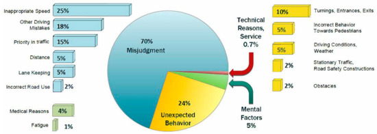Accidents are considered one of the most detrimental aspects of the usage of automobiles. Due to the high density of vehicles, potential threats and road accidents increase [1]. Road accidents are of great importance to all humanity, and this is a challenging issue that needs to be considered [2]. Ordinarily, these accidents stem from driver errors, such as speeding and aggressive driving [3]. Due to the ephemeral nature of Vehicle-to-Vehicle (V2V) networks, no individual vehicle can have a good view of the other vehicle’s incident report behavior to reason about trustworthiness effectively. However, if one can design an effective mechanism to collect observations and experiences about individual vehicles, it would greatly facilitate the process of aggregating partial and incomplete information into meaningful intelligence [4]. Simultaneously with the increasing worldwide demand for transportation, the challenges that drivers face every day are growing considerably. The situation analysis reports that major casualties are due to the improper driving behavior of drivers. According to the accident research statistics, 75% of fatal accidents are caused by such human factors as lack of attention, stress, loss of orientation, tiredness, medical condition, etc. In 24% of the cases the unexpected behavior is the cause of the accident and only 0.7% of accidents are due to technological failures (Figure 1) [3,5,6,7].