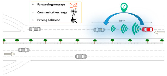 Furthermore, ref. [20] developed a non-intrusive approach based on machine learning (ML) algorithms and dynamic vehicle data as inputs to a real-time framework for detecting and classifying driver distraction. Moreover, ref. [21] used nonlinear regression techniques and artificial neural networks (ANN) to build a driver model that can predict each human driver’s regular driving on a given road segment with a realistic degree of precision. Authors in [22] verified the accessibility of the V2V using a laptop for network measurement using two vehicles to establish datasets of vehicle sensor readings associated with cellular and dedicated short-range communications (DSRC) connectivity measurements, while [23] presented a study of V2V connectivity and data collection in two research vehicles using industrial on-board units (OBU) and light detection and ranging (LiDAR). Authors in [24] proposed architecture integrates both data mining techniques and neural networks to produce a hierarchy of driving types. The authors have introduced a neural network-based algorithm that can define the type of road on which the vehicle is traveling, as well as the degree of aggressiveness of each driver, using OBD parameters, such as altitude, acceleration, and RPM. Last but not least, ref. [25] suggested an analysis of a collision warning system (CWS) focusing on driving behavior to assess the collision danger level based on the driver’s driving behavior. Unfortunately, many earlier studies relied on estimates of prevailing and pre-crash speeds, thus reducing their soundness. A speed reduction reduces the forces at impact during a crash; however, what is still unknown is whether speeding behavior leads to increased crash risk. To solve this problem, one must know something about the driver’s general speeding behavior and the speeding behavior before a crash [14]. Therefore, to illuminate the specific problems related to the V2V warning system based on driving behavior, three issues have been illustrated in this research. In the first issue, several criteria need to be considered in the V2V communication system, specifically regarding the forwarding message. These criteria include vehicle information, speed, location, and type of driver (Figure 2). The interactions between the key components of vehicular traffic concerning time and space can be viewed as a typical human–machine system, i.e., driver (human), car (machine), and environment [12]. It is essential to comprehend the relationship between anticipating potential collisions and deploying collision avoidance techniques [26]. The second issue that needs to be considered is dedicated to driver model development, which predicts each driver’s normal driving on a specific road segment with a reasonable degree of accuracy [16,25]. In this regard, the tradeoff and conflict among the criteria are reflected in the learning and identifying driving behavior selection process.