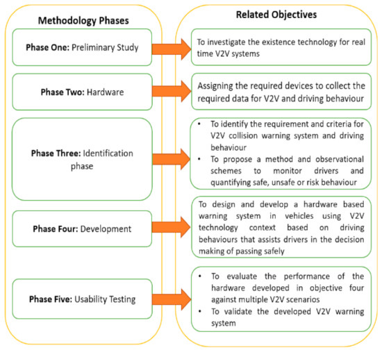 This section presents the number of phases that are used to explain the research methodology. Five main phases are used to get the proposed system’s objectives, as shown in Figure 4. The first phase (preliminary study) dealt with identifying and describing the research problem. The second phase (research and analysis) identifies the requirement and criteria for V2V collision warning system and driving behavior to define a method and observational schemes to monitor drivers and quantify safe or risky behavior. The third phase (hardware design) involves designing and developing a real-time hardware-based V2V warning system based on driving behavior. The final phase (usability testing) validates the performance of the proposed methodology.