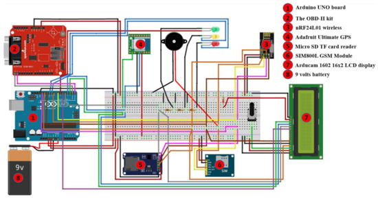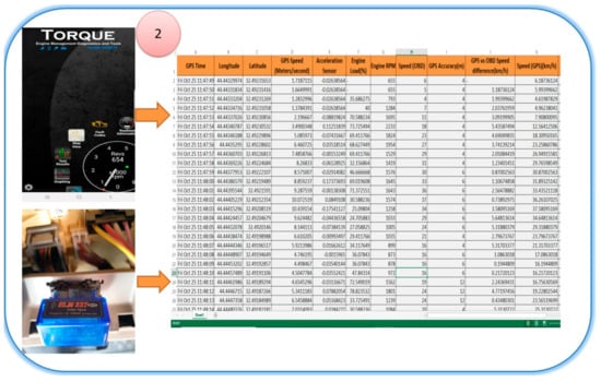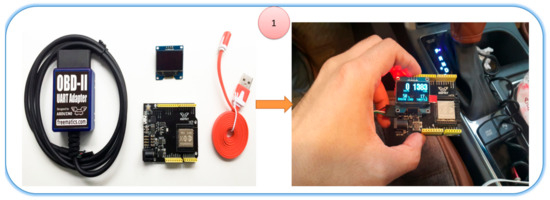 Identification of driver behavior is a prerequisite for traffic studies and has several applications, including road safety analysis, microscopic traffic modeling, and ITS. Driving behavior research is beneficial for various challenges in transportation engineering. These provide data collection for mathematical analysis as well as detecting driving models and parameter estimation. Data on driving behavior is obtained using an instrumented vehicle (IV) with GPS, radar, cameras, and other sensors. Several tools for observing behavior are available, some of which run on the roadside and others on the vehicle. First, in the case of roadside sensors, an unaware driver monitored while driving on the selected vehicle in the experiment site; various technologies can be used to observe driving behaviors. Second, on-board sensors mounted on IVs allow for more extended measurements under more flexible experimental conditions and the ability to observe certain maneuvers of specific interest in a controlled manner. In this system, on-board sensors can be used to capture and analyze driver behavior data, representing data collection, transmission, and back-end platforms focusing on providing services and solutions in the vehicle domain with on-board services and connected vehicle-related services. OBD-I is an automotive term referring to a vehicle’s self-diagnostic and reporting capability used in modern vehicles compatible with standard computer protocols. This adapter can connect to the vehicle network using this adapter. It works similarly to a network modem or gateway. It converts messages from one protocol to another; typically, data flow in all directions to and from the electronic control unit (ECU) [30,33]. Moreover, a Freematics ESP32 OBD-II Kit is built on the Freematics Esprit, an Arduino compliant ESP32 development board, as well as a 1.3″ OLED display and a Freematics OBD-II universal asynchronous receiver–transmitter (UART) Adapter, as shown in Figure 5.