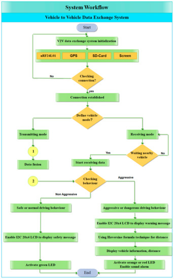 The proposed V2V warning system based on driving behavior comprises a preprocessor stage, driving behavior model analysis stage, and a collision potential identifier stage. An Arduino UNO board was used to build the communication mechanism. The OBD-II cable adapter and nRF24L01 unit are used in the proposed framework to make communication between vehicles. For high-speed, high-sensitivity logging or monitoring, an Adafruit ultimate GPS breakout was used to provide 10 location updates per second. A micro SD TF card reader module with a serial peripheral interface (SPI) interface and chip-level conversion is used for data logging. A Geekcreit I2C 20 × 4 LCD monitor blue module for Arduino is used to display the message to the driver inside the vehicles. The information collected from the first stage was merged in the second stage. This step involves verifying the research’s requirements, limitations, and timeframe for completion and developing a mechanism for selecting the destination vehicle for broadcasting information obtained by the proposed system to exchange data between vehicles and alert the driver about the aggressive drivers. The sensor and microcontroller circuitry are built in the next step. Finally, the hardware is troubleshooting to determine its performance. Any deficiency can be remedied by changing the circuit and coding before the device is operating at full potential. Debugging is carried out to make the code better. Finally, software and hardware should be incorporated to ensure everything is running smoothly into one complete system.