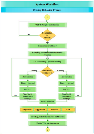 Driving behavior is a contributing factor in most road crashes. As a consequence, there is a significant benefit in identifying drivers who engage in unsafe driving practices. Furthermore, it is critical to developing advanced driver assistance systems toward increasing vehicle automation levels. Innovatively, a developed driving behavior analysis approach is proposed based on vehicle OBD-II and V2V algorithms. The suggested system gathers vehicle activity data, such as vehicle speed and engine RPM. Data of a driving behavior collected from the driving tests are used to develop a driving behavior model. Data from the OBD-II interface that were not used for learning were used for the test scenario. The proposed approach then employs V2V algorithms to build a driving behavior classification model, which can then be used to decide if the actual driving behavior is safe or not. The targeted critical behavior identified for this paper is acceleration, and therefore, “safe performance” is based on driving within the confines of the proposed acceleration values. The algorithm procedures of driving behavior are done first by initializing the OBD-II connection. Then the system starts gathering driving data to determine driving status in acceleration or deceleration, which can be done from a series of consecutive readings calculations obtained from OBD-II reader. The driving mode is defined in terms of the difference between two successive readings, where upon reaching a certain number of readings (5 or 10 flags). The driver’s behavior is defined, then these flags are stored and sent to neighboring vehicles. The main program workflow is illustrated in Figure 9, representing the driving behaviors data collection and identification process.