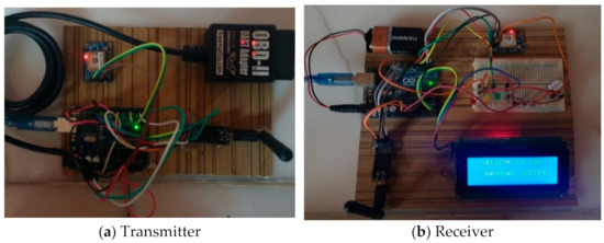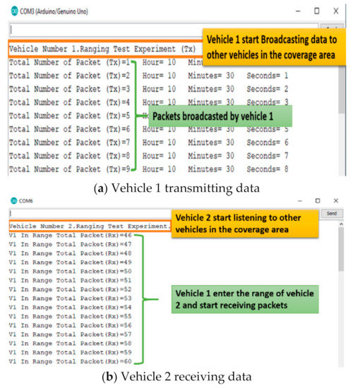 The data exchange in V2V is measured using several vehicles with various locations and scenarios based on the nRF24L01 + PA/LNA wireless transceiver module with an external antenna and the Arduino Uno board connected to collect the data in each experiment scenario. The nRF24L01 + PA/LNA module is abundant in the market and at low prices and provides much better coverage than other devices. The data transfer rate was set at 250 Kbps, and the output power was 0 dBm. The two devices were connected via seven wires: power supply (3.3VCC), ground (GND), chip select not (CSN), chip enable (CE), serial clock (SCK), master in, slave out (MISO), and master out, slave in (MOSI)- attached to PCs through a USB cable in both the transmitter and receiver. There are two essential components in aggregating data from multiple vehicles. The first component describes the communication process by which the data are transmitted to the vehicle and what form the data takes for a given process. The second component in data aggregation involves how the data are stored and indexed appropriately for any detection algorithm. For data collection, there are several steps involved in connecting and installing the nRF24L01 V2V device. After completing the installation and uploading codes to collect data on the microcontroller, connect a 9 v battery to power up the device. Next, each device is mounted inside the vehicle; then, the system directly starts sending information to nearby vehicles and receiving data if any vehicle enters the first vehicle’s coverage area. Each message includes information about this vehicle and the count number of the sent data. Once this vehicle has joined the other vehicle’s coverage area, the second vehicle begins receiving these messages from its entry into coverage until its exit from the broadcast range. The overlapping area between moving vehicles can be classified into three cases: total overlapping, no overlapping, or partial overlapping. The probabilities of conjunction and disjunction in extreme cases, complete overlapping, and no overlapping are easy to calculate. However, the third case to determine the conjunction and disjunction probability values is different since the overlap between two events is a variable. Once the total overlapping occurred, the vehicle (vehicle 1) transmitting data to the other vehicles within the coverage area (Figure 10a). On the other side, another vehicle (vehicle 2) entered the coverage area, receiving all information sent from the first vehicle (Figure 10b).