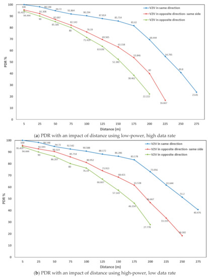 The results of PDR given by the nRF24L01 + PA/LNA antennas are presented and explained in this section. PDR is defined as the number of received packets divided by the number of transmitted packets. The experiments used two OBUs at varying distances and calculated the package delivery rate to test the efficiency of the V2V under various scenarios. The distances ranged from (0–300) m, with a 25 m interval. Furthermore, the tests were carried out in two scenarios. First, by setting the nRF24L01 + PA/LNA with lower power and high data rate of the transmitter. Second, we change the setting of the nRF24L01 + PA/LNA to maximum power and lower the data rate of the transmitter. At 250 Kbps, the nRF24L01 + PA/LNA has the best receiver sensitivity, which is −94 dBm. The receiver sensitivity decreases to −82 dBm at a 2 MBps data rate. Setting the output power also helps to extend the range of the transmission range in the proposed system. The output power of the nRF24L01 + PA LNA is set to 0 dB, −6 dB, −12 dB, or −18 dB. All of the experiments were conducted outside, with a spacing between the two nRF modules ranging from 25 to 300 m. For each distance, 1000 packets are sent, and the PDR is determined by dividing the number of successfully received packets by the total number of sending packets. The results are shown in Figure 11.
