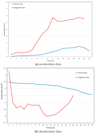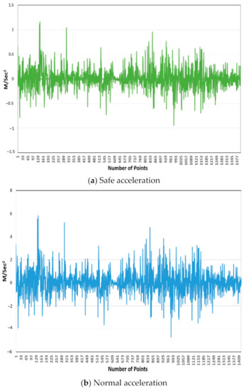 The proposed system generates a warning message and an estimated distance for the vehicles based on their driving behaviors within the coverage area. Recognition of driving behaviors is a subjective mechanism dependent on the driver’s experience and response to changing environmental constraints over time. Driving environment and behaviors are well recognized to depend on individual experience and calculation with a high degree of ambiguity. As a result, developing a high-level design solution that incorporates existing technology and cognitive systems to develop a unique approach to understanding driving behavior trends is critical. At the beginning of the proposed design, the V2V system defined driving behavior using specified codes. The system read each instantaneous OBD-II reading speed to calculate the instantons acceleration or deceleration of each driver. Figure 12 shows the longitudinal acceleration for normal and aggressive drivers.