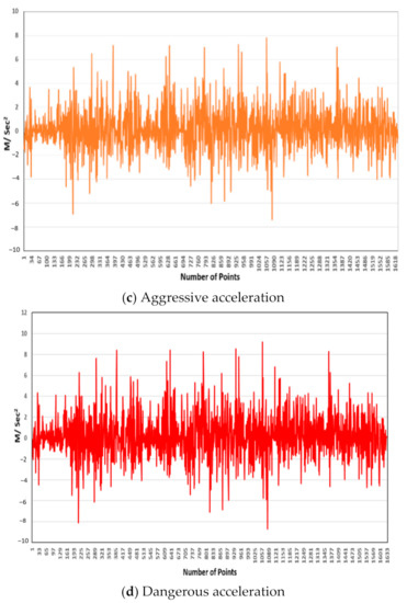 The system produces a warning message and a distance estimate for vehicles based on driver behavior within the proposed system’s coverage area. Recognition of driving behavior is a contextual process that depends on the driver’s perception and response to changing external pressures. Individual variability in knowledge and measurement is well understood to underpin the driving atmosphere and behavior. A high-level architecture paradigm integrating modern technologies and cognitive frameworks to provide a new approach to recognizing underlying behavior patterns is crucial. The various experiments show acceleration data similar to previous researchers, with a few slight variations. As seen in Figure 14, these data were inserted into the proposed scheme to characterize driving efficiency.