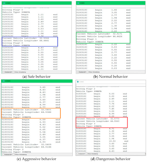 Acceleration values ranging from around 2 m/s2 are indicative of safe driving behavior. On the other hand, standard driving can require more efficient but still expected braking, resulting in more intense acceleration values ranging from 2 to 4 m/s2. The probability of a collision begins at 4 m/s2, which represents aggressive drivers in this analysis. According to the dangerous assessment, the driver uses abrupt motions in terms of speeding starting at 7 m/s2. These variations in acceleration results were noted for future conflicts due to the differences in the drivers who conducted the experiments. We can see from the fact that some of them drove instinctively, while the others drove aggressively. As seen in Figure 15, the test results were successful where the driver’s behavior was shown based on real-time acceleration readings obtained from the OBD-II system attached to the vehicles.