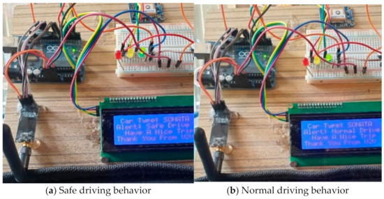 The proposed algorithm uses an nRFL24L01 with an OBD-II transceiver that can be mounted in a passing vehicle. These sensors provide information, such as the impeding and opposing vehicles’ speed, direction, and distance at any period (Δt). Sensors send a signal to search the lane for any oncoming traffic. The algorithms use a reading sensor and a processing unit with a DVI unit to evaluate whether a “secure” message should be shown for the passing vehicle’s driver. First, the transmitter is placed inside the first vehicle with the OBD-II connected to the engine control unit (ECU) to obtain driving behavior and consider it as a power source for the board as a whole. In the second vehicle, the receiving device is placed on the dashboard of the second vehicle. A suitable and reliable external warning system has been used to inform the drivers about the driving conditions. However, getting the driver’s attention is a difficult task and is linked to his or her psychological conduct. Humans tend to adjust and completely disregard statistical regularities. One suggestion is to use lighting LEDs as a visual stimulus in the vicinity of nearby vehicles to attract drivers’ interest. In contrast, a big screen with a consistent background color installed on the dashboard suffice to get the driver’s attention. The V2V device uses a 20 × 4 I2C character LCD mounted on the microcontroller testing board for testing. The display is capable of displaying four lines of twenty dot matrix characters. If normal behavior occurs, the green LED starts flickering as a simple type of additional alert for the driver. It displays Normal on the board to notify the driver inside the vehicle, especially the surrounding vehicles is normal, and it does not represent any threat with no further calculation or analysis needed, as shown in Figure 16.