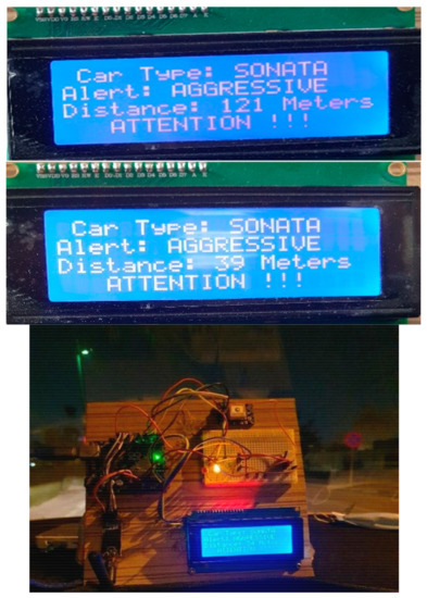 For aggressive and dangerous driving behavior experiments, two vehicles have been used in leading and the following position on the highway roads to check the system performance in aggressive and dangerous behavior. The nRF24L01 + PA/LNA transceiver antenna data and the vehicle type and flag status were sent to neighboring vehicles. On the receiving vehicle’s far side, the system displays the transmitted flag while measuring the distance between moving vehicles with the GPS unit built into the board. Moreover, as long as the sending vehicle is within the receiving vehicle’s coverage area, the V2V system turned on the orange LED with a periodic assessment of the distance between vehicles, whether the vulnerability is approaching or drifting away. Figure 17 indicates a warning signal shown by the LCD installed in the V2V system. The risky evaluation signifies that the driver makes abrupt motions in acceleration, starting with 7 m/s2. The warning system is triggered based on these results, using the same procedures as in aggressive behavior. The receiving vehicle device displays the sent flag and uses the GPS unit placed on the receiving board to calculate the distance between the two moving vehicles. The buzzer and the red LED should be enough to catch the driver’s attention.