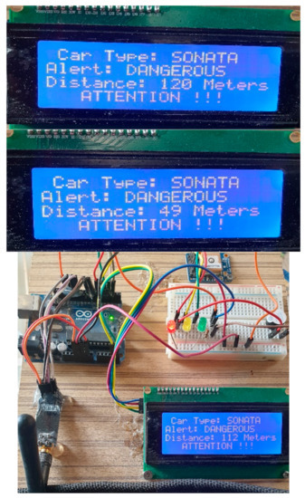 As long as the sending vehicle is within the receiving vehicle’s coverage range, the V2V device continuously updates the distance between two vehicles, whether the vehicles are approaching or drifting away. Figure 18 indicates a dangerous signal displayed by the LCD installed in the V2V system.