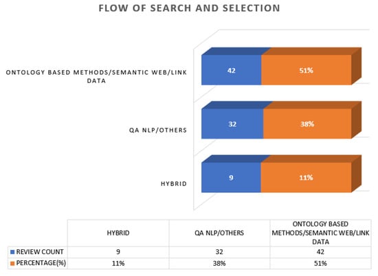Here we discuss the classification of ontology-based approaches to QA, and present the categories created to classify the 83 papers reviewed by this study, which are associated with ontology methods that semantically enhance the QA. In order to extract and classify the data, the study extracted data at the full paper reading stage, creating five categories to classify the reviewed papers (Table 1). In total, of the 83 papers reviewed, only 42 mentioned ontology methods in QA directly, while 41 discussed QA NLP among other methods (Table 3); of the 83 papers reviewed, 42 (50%) employed an ontology-based paradigm, 32 (38%) used a QA NLP paradigm, and 9 (11%) employed a hybrid approach. There was a higher use of web-based and NLP approaches than hybrid paradigms (Figure 2), which concurred with the findings of [13].