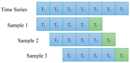 The sliding window [] constructs one sample for each time recording unit T. The samples of Tn use the values within [Tn_p, Tn) as features and the values at Tn as labels or targets, p is called the sliding window size. A sample plot of the sliding window construction time series is shown in Figure 1. T1 to T6 are the original time series inputs, and the size of the sliding window is set to 5. Sample 1 features four data from T1 to T4, and T5 is the label of sample 1. Sample 2 features four data from T2 to T5, T6 is the label of sample 2, and so on, the original data of length 9 can build five time series samples. It can be seen that the value of the window size affects the number of time series samples and the features in the samples. For a given data set, a smaller window size means more samples and fewer features; a larger window size means fewer samples and more features.