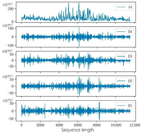 where, and are the dual operators that are and , respectively. In this paper, a four-layer decomposition followed by reconstruction is performed using the db4 wavelet fundamental to obtain a total of four high-frequency detail components of , , , and one low-frequency approximation component of . Figure 2 shows the results of the wavelet decomposition of PM2.5 for the supply and marketing agency. It can be seen that the A4 low-frequency series has obvious trend as well as certain periodicity, and D1–4 reflects the random fluctuation changes in the trend of the original time series.