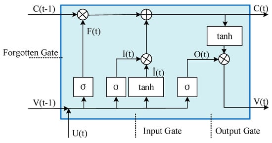 LSTM artificial neural network [] is a special type of recurrent neural network that is capable of learning long-term dependencies. Even for the longest sequential data, LSTM can avoid gradient disappearance or gradient explosion, and it is widely used to solve sequential data problems such as automatic speech recognition and natural language processing. As shown in Figure 3, LSTM has a complex recursive structure connected in time order, LSTM has two important properties, one is the hidden layer state that changes with time, and the other is the cell state that maintains long-term memory. The cell state is determined by the input gate , forgotten gate and output gate at this moment with the hidden layer state and cell state at the previous moment; the hidden layer state is determined by the cell state and input data at this moment. the updated Equations (4)–(9) for the cell state and hidden layer state in LSTM are as follows: