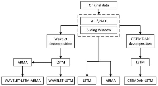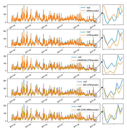 In order to verify the validity of the prediction model proposed in this paper, the model proposed in this paper was compared and analyzed with other prediction models. In addition to the prediction models proposed in this paper, four other prediction models were applied, including two single prediction models, LSTM and ARMA, and two hybrid models, CEEMDAN-LSTM and WD-LSTM, respectively. The architecture of these five prediction models is shown in Figure 5. The WD-LSTM prediction model is to send the four high-frequency sequences and one low-frequency sequence obtained from wavelet decomposition into the LSTM prediction model for prediction, and finally the prediction results of each sequence are reconstructed to obtain the final prediction results. the CEEMDAN-LSTM prediction model uses the CEEMDAN decomposition [] method to the original data is decomposed, and then the decomposed subsequences are sent into the LSTM separately for prediction, and finally the predicted results are reconstructed to obtain the final prediction results.