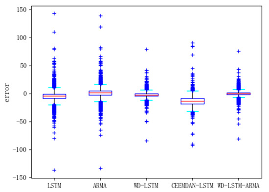 Combined with the error box diagram in Figure 7, it can be seen that there are large error points in LSTM and ARAM, and the overall error range is also larger compared to the hybrid prediction model. CEEMDAN-LSTM suffers from most of the predicted values being smaller than the actual values, and there are also large error points relative to WD-LSTM and WD-LSTM-ARMA. WD-LSTM and WD-LSTM-ARMA perform better, but WD-LSTM-ARMA has a more concentrated overall error and the smallest mean absolute error.