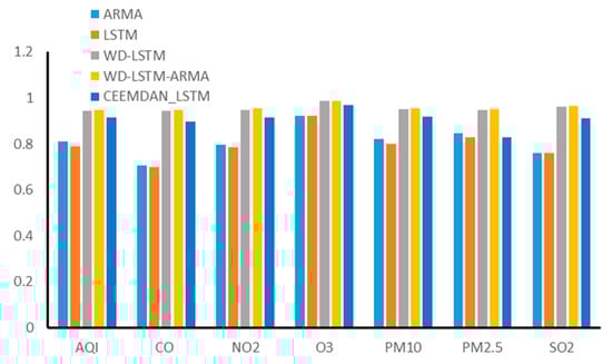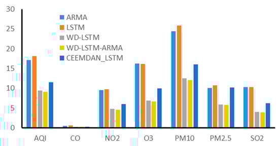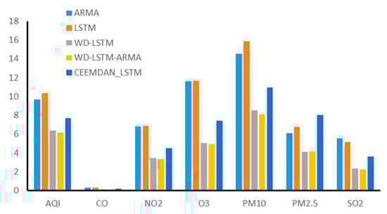 The prediction performance of the five prediction algorithms was evaluated by taking the mean values of the evaluation indexes of the prediction effects of the six air pollutants and the AQI from six monitoring stations in Tangshan City. As can be seen from Figure 8, Figure 9 and Figure 10, the single prediction models LSTM and ARMA are not satisfactory in predicting either the six air pollutants or the AQI. Overall, the hybrid model predicted all six air pollutants and AQI better than the single prediction model, with CEEMDAN-LSTM performing worse, indicating that the single CEEMDAN decomposition method was not able to fully extract the effective information of the time series. Although the prediction models of WD-LSTM and WD-LSTM-ARMA have similar prediction performance with similar accuracy in predicting PM2.5 concentrations, WD-LSTM-ARMA is significantly better than WD-LSTM model for other pollutants as well as AQI, and the WD-LSTM-ARMA code has shorter computing time.