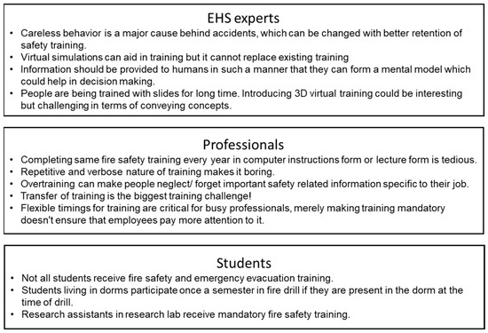 We adopted a Lean Startup [30] methodology to obtain experts’ unbiased opinions on the fire safety training system. The Lean Startup methodology advocates developing products/services based on validated learning, i.e., learning requirements from customers, asking for their feedback quickly, and improving the system under development. Major stakeholders—students, lab assistants, faculty and staff, Environmental Health and Safety (EHS) experts, and professionals from government and private organizations were interviewed. The interview process helped to understand the frequency of fire safety training, the audience of the training, and the level of knowledge expected by the trainees. In addition, 45 personnel of varied ages, races, and genders were interviewed. These interviewees were classified into three groups—students, professionals, and EHS experts. The feedback obtained from interviewees is summarized in Figure 1.