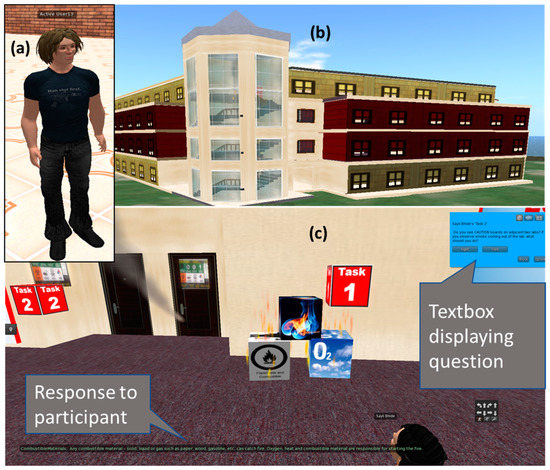 The next step was to develop a scenario on fire safety and emergency evacuation based on expert interviews, the literature, and the university’s evacuation procedure and safety training. Information about the emergency exits, finding the nearest exit, reporting an emergency, and avoiding use of the elevator during a fire emergency are covered in both training modules. An avatar is a 3D representation of a person in a virtual world (Figure 2a). The avatar is required for interacting with the objects in the virtual world. One can also control his/her avatar’s appearance by choosing body parts, skin, hair, clothes, footwear, and accessories. Four intelligent agents are placed in the environment to help participants with navigation and completion of tasks. For example, an intelligent agent points the player toward the correct exit. Participants cannot distinguish between an intelligent agent and an avatar of another participant. The behavior of intelligent avatars is programmed using the Linden Scripting Language (LSL) in OpenSim. In VSW, feedback is provided after every task. When participants touched objects in virtual training, they received tasks, and their responses to these tasks were saved in an external database [33]. A dialog box opens on the screen, displaying a question and options from which a correct answer needs to be selected (Figure 2c). For example, an avatar can see a computer catching fire in VSW and is asked about the action that he or she would take in this case. Depending on the participant’s response, the correct response in such a case is displayed on the screen.