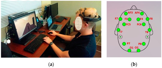 A 14-channel, non-invasive EEG headset was used to measure the neural signal powers of 40 participants (20 assigned to SBST and 20 assigned to VSW), randomly selected among the 143 participants. The EEG headset was placed on the participant’s head, and their neural response was measured while undergoing fire-safety training (Figure 4a).