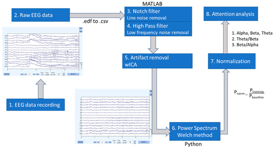 The EEG signal recorded by electrodes from a person’s scalp is a combination of neural signals and artifacts. Eye blinks, muscle movements, line noise, and the amplifier situation are significant sources of artifacts [43]. Thus, EEG data were first processed to remove artifacts from recorded data before performing an attention analysis. The procedure of data processing and analysis is explained below (refer to Figure 5).