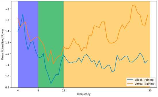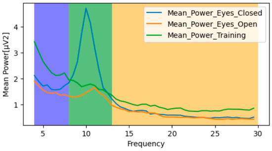 The mean power in alpha and beta bands for VSW participants in ‘eyes closed,’ ‘eyes open’ and ‘training’ modes is presented in Figure 6. In the relaxed state of mind with ‘eyes closed,’ power in the alpha band increased in participants. During the training phase, power in the alpha band reduced, while power in theta and beta bands increased during the ‘eyes closed’ phase.