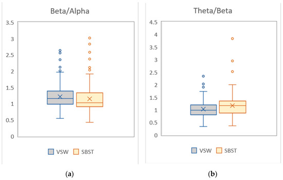 Attention level: (a) Beta/alpha ratio on VSW and SBST; (b) theta/beta ratio on VSW and SBST. Box plots represent distribution of the normalized power of VSW and SBST participants obtained from qEEG measurements during training. Symbol X represents mean.