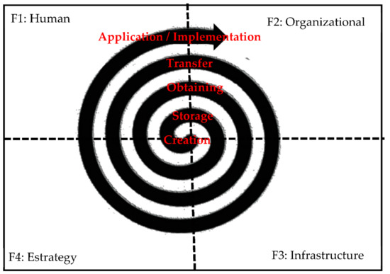 Next (Table 4), each of the factors (F) that affect knowledge management are analyzed: (1) human factor, (2) organization factor, (3) infrastructure factor, and (4) strategy factor [9] and the components of each of them (shown in Figure 1). This analysis is carried out through the stages that are commonly shown in Figure 5): creation, storage, obtaining, transfer, and application of knowledge [14].