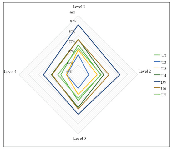 In Figure 6, the model’s measurement proposal was developed around four levels: basic, intermediate, advanced, and expert.