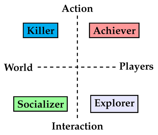 Bartle identified and described four approaches to playing MUDs [13]. MUDs are the precursor to MMORPGs, so MUDs’ division can also be used as a reference for MMORPG players, which given by four factors: the number of achievements within the game, the level of exploration of the game, the magnitude of socialization with other players, and the level of imposition upon others. Based on each factor, the player is categorized as an achiever, explorer, socializer, or killer. It is important to note that these types of players are not fixed but switchable, depending on state and mood [15,16].