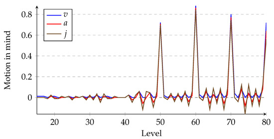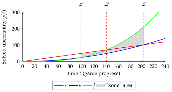 Different psychological experiences during game progression (adopted from [44]). The cross point between the line with velocity v, the curve with acceleration a, and curve with jerk j. Additionally, , , and represent the bounds for effort, achievement, and discomfort, respectively.