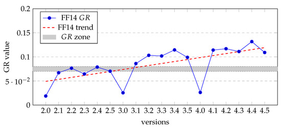 Figure 3 shows that due to the excessive total number of quests, the GR value of main versions (X.0) is less than the sophistication (). In the subsequent minor versions, most of the main quests and regular quests (telling the story and providing experience) were implemented in the main version. Thus, a high proportion of special quests makes the GR value more prominent towards the zone values. In turn, the game-playing experience was not suited for the explorer in the first minor version of the game update because the main goal was to complete the main story (main quest) and level up (regular quest). In later minor versions, there was no need to level up, and the quest system was focused on opening up more features (new instances and side stories), making the GR value increase, providing more options to explore. By the fifth minor version update, the game experience was best suited for an explorer.