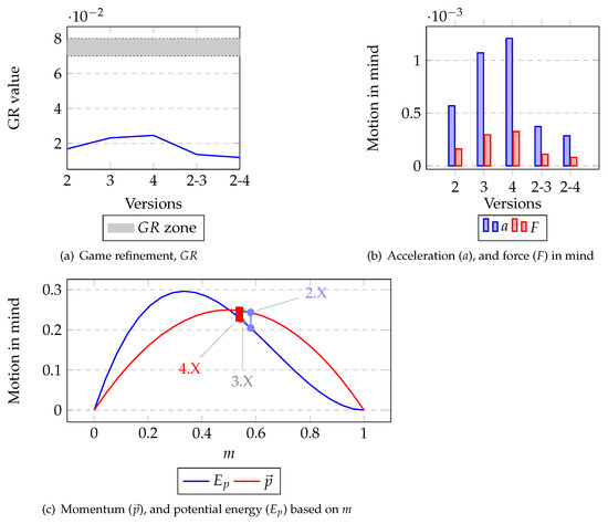 With the optimization of the game progress model, the relationships between accelerations in game progress and the emotions can be obtained [41,42,43]. Iida and Khalid investigated a mechanism by adopting a logistic model of game outcome uncertainty for which a measure of GR had been derived [44]. This method can determine the balance between skill and chance in game design. The GR and flow theory’s relationship is determined and discussed by considering the game progress model, thereby formalizing the law of motion in the game. Table 2 shows that various physics quantities can be measured in the game. This correspondence allows us to understand the psycho-physical quantities in various games better to have an intuitive understanding of the player’s game playing experience.