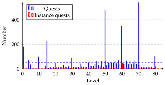 The proportions of instance quests to total quests were the highest at level 50 and level 70. This condition was an intentional design: to put a series of instances as the climax at the end of each version. Moreover, most of the quests of version 2.1, version 2.2, and other minor versions are also at level 50. When the highest level is reached, the next achievement for the achiever involves improving their equipment. Better equipment and skill improvements are achieved in the instance quests, where achievers strive for challenging instances to become stronger.