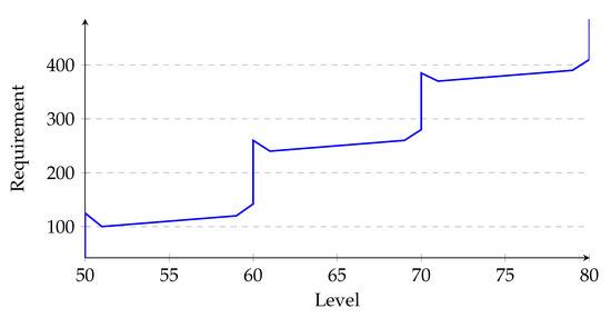 Achievers dare to be challenged, but challenges beyond their ability will undoubtedly reduce the players’ enthusiasm. Based on flow theory and motions in mind [44], when the environment strikes a balance between being challenging and suiting the ability of the player, the best psychological experience can be expected. Instance’s requirements for the quality of equipment can be used to measure the difficulty of the instance (Figure 7). There is no equipment quality requirement before level 50, indicating that these dungeons’ difficulty is relatively low in the designer’s view. Therefore, the progression rate for achievers should be within . Simultaneously, they ensure that jerk is less than acceleration, preventing players from changing too fast or finding it difficult to adapt to the challenges.
