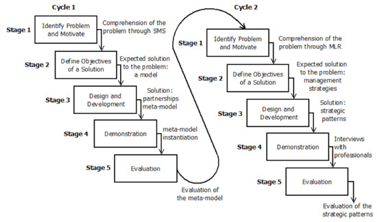 We adopted the DSR process proposed by Peffers [33]. That process was chosen because it focuses on the execution of Design Science Research in the Information Systems area and is widely referenced in the literature. Figure 1 describes the stages of Design Science Research as described in Peffers [33] and presents how we conducted each stage of the research. In this paper, we report the results of two DSR cycles. We explain how each stage was performed in the following sections.