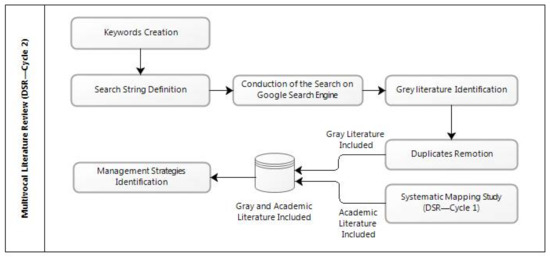 In this stage, a Systematic Mapping Study (SMS) and a Multivocal Literature Review (MLR) were performed in the first and second DSR cycles, respectively. An SMS synthesizes available peer-reviewed primary studies, characterizing relevant concepts on themes and identifying the maturity and comprehensiveness of a research area [34]. In contrast, an MLR aims to aggregate studies from the gray literature and peer-reviewed papers to obtain knowledge from academic and professional perspectives, closing the gap between academic research and professional practices [35].