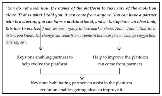 As the strategic patterns were designed to help companies migrating from a software product approach to an ecosystem, six interviews were conducted with professionals who participated in that change type. The analysis of these interviews was carried out according to guidelines by Seaman [50] and Cruzes [51]. First, the audios of the six interviews were verbatim transcribed. Then, the analysis of these transcripts started with open coding. The codes created were associated with the text excerpts, as presented in Figure 3.