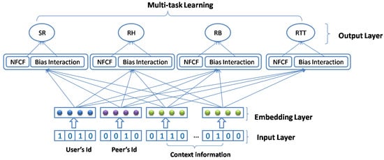 In this section, we introduce the MNCF model for blockchain QoS prediction, including the overall architecture and the details of each layer. As shown in Figure 2, it comprises three components: an input layer, an embedding layer, and task-specific layers. UserID, PeerID, and context information (country, autonomous systems, IP address, and time zone) appear in vector form for the input layer. In the embedding layer, we set the embedding for the users, peers, and context information to capture the implicated semantics. The input and embedding layers synergistically form shared layers, sharing users, services, and context information and preparing for task-specific layers in multi-task learning. In the task-specific layers, we calculate the user bias term in the context and predict the QoS values, such as the RB, RH, RTT, and SR. In particular, we accomplish multi-task learning in different task-specific layers, which can share the parameters for each layer to obtain better performances.