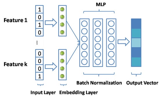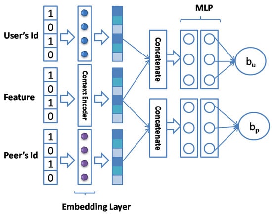 In the input layer, we used UserID and PeerID as identity features and then transformed them to binarized sparse vectors with one-hot encoding. In addition, we presented a context encoder network for the feature interaction of context information. As shown in Figure 3, the feature interaction of our context information was realized through this module. It is important to fully utilize all features for learning fusion to obtain the context information vector, which can express all features. We stacked multiple fully connected layers to enable different features to learn to fuse. However, merely a vector concatenation cannot fully represent the potential features between users and peers. Therefore, we adopted a multilayer perceptron (MLP) [] to learn the features. The MLP model under this layer is defined as follows: