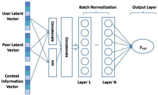 where K denotes the dimension of the latent space. MF can be regarded as a linear model of latent factors, and it cannot learn more complex interactions between the user and peer’s hidden vectors. Hence, He et al. [] presented a method known as neural fusion CF that uses a neural network instead of the inner product in MF. Furthermore, the input of this neural network can be well utilized to directly target user, peer, and context information vectors, thereby addressing the difficulty in constructing a CF model using context information. In addition, to increase the diversity of input features, we adopted addition operations on the user and peer vectors, as shown in Figure 4.
