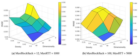 As shown in Figure 6a, when we set MaxBlockBack = 12 and MaxRTT = 1000, the effects differed when dimensionality was increased with different densities. Notably, the performance improved in most cases when the dimensionality increased. As the dimensionality approached 64, the values of RMSE began to increase when the MD ranged from 30% to 45%, whereas the values were the smallest when the MD was set to 50%.