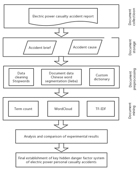 Figure 1 depicts the experimental scheme for this paper by document mining, which consists of six steps: document collection, document storage, document preprocessing, document mining, analysis and comparison of experimental results, and final establishment of key hidden danger factor system of electric power personal casualty accidents. This paper collects 225 electric power casualty accident reports from the Compilation of National Electric Power Accidents and Electric Power Safety Events (2014 to 2018) [2,36,37,38,39] provided by the National Energy Administration’s Electric Power Safety Supervision Department; document mining experiments are carried out for the accident brief and cause in each accident report.