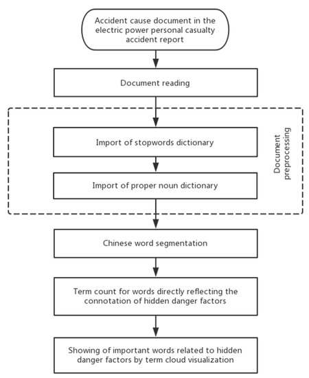 After reviewing prior research, it was discovered that text mining technology has not yet been fully used in the electricity industry, particularly in China. Moreover, the existing research has not taken into account the factors that can help to eliminate the hidden hazard. As a result, we proposed a three-step strategy for the construction of a major hidden danger factors system applicable to China’s electric power personal injury occurrences. The first stage is to identify hidden danger elements that can be eliminated through management by conducting literature research and integrating it with the three-class theory of danger sources. The second step is to design the text mining process, which includes document preprocessing, word cloud building, and term frequency counting, as well as to screen the most important hidden danger factors using the parameters of hidden danger factor proper terms in the text that are related to the hidden danger factors obtained in the first step. The system of the main hidden danger factors of power personal injury accidents is developed in the last step, using the results of the previous literature research and text mining.