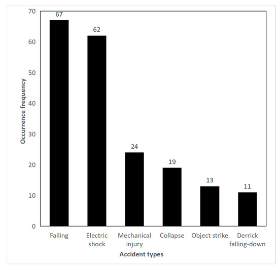 As stated in Section 4.1, the accident text used in this study is a compilation of 225 electric power personal casualty accident reports from the national compilation of electric power accidents and electric power safety incidents (2014 to 2018) compiled by the national energy administration’s electric power safety supervision department. Each article is divided into three sections: a brief account of the accident, the causes of the event, and ideas on how to rectify it. As a result of the unified subject compiling the compilation set and the state having relevant provisions on the terms and format of power accident report writing, the 225 texts may better adapt to the text mining method and process of this study. This study begins with a simple word count of accident type phrases in the accident description section to determine the number distribution of various sorts of accidents. The text of the accident’s cause is then mined using word cloud and TF-IDF technologies.