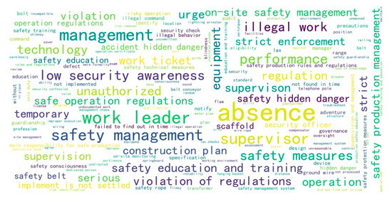 The relevant phrases connected to the concealed hazard variables as accident causes in 225 electric power personal injury accident reports (2014 to 2018) are graphically represented using the word cloud analysis approach described in Section 4.3; see Figure 4 for the drawn word cloud. Terms such as “absence”, “work leader”, “management”, “safety management”, “supervisor”, “inspection”, and “violation” appear most frequently and are most frequently used in accident cause documents to explain the accident cause, and their frequent occurrence also represents the high possibility of related hidden danger factors in common accidents.