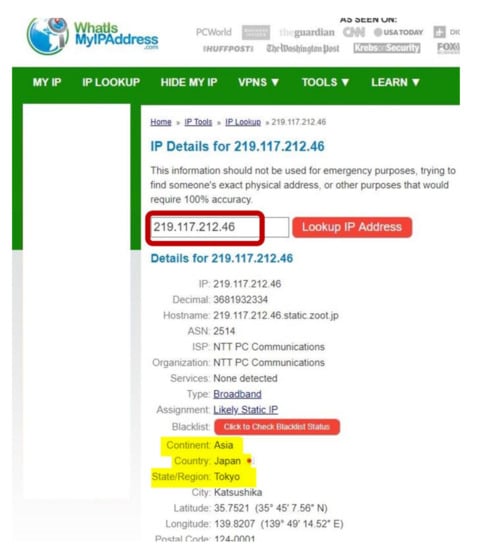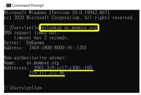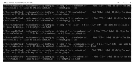 To evaluate the performance of IPv4 and IPv6, dual-stack sites from all over the world have to be identified beforehand. At first, we obtained the list of dual-stack sites or IPv6-enabled hosts from [10,25,26]. By consolidating the information from these three sources, the information of 5515 sites was obtained. The sites were then classified into regions and countries according to their top-level domain name. For the sites that could not recognize the geolocation based on the domain name (e.g., .com), the network utility tool of “nslookup” was used to determine the information. It queries the specified DNS server to retrieve the requested domain name or IP address, as shown in Figure 2. The website of iplocation.net was also used to identify the geolocation of sites, as illustrated in Figure 3. However, the geolocation information of 125 sites could not be identified, and they were removed from the list. Thus, a total of 5390 dual-stack sites were considered in this study.