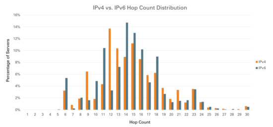 The hop count can be regarded as the length of the path. It can also be used to access the status of IPv4/IPv6 deployment. This is because the increased number of hops is usually the result of widespread deployment. Note that a higher hop count does not mean higher delay; it is because widespread and new deployments usually involve faster routers and more bandwidth, which could lead to lower round-trip time. The round-trip time in IPv4 and IPv6 networks is discussed in the next section.